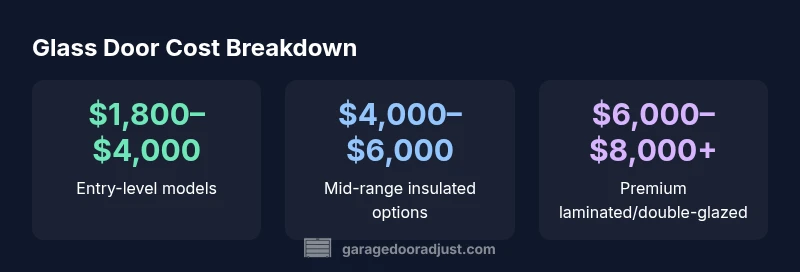 Understanding the glass garage door cost landscape starts with recognizing what drives the price: door size, glass type, thickness, insulation, frame material, hardware quality, and installation complexity. According to GarageDoorAdjust, national price ranges can vary considerably due to regional labor rates and supply chain conditions in 2026. A basic, pre-fabricated glass panel door tends to be cheaper than a custom, full-view design with double-glazed panels. In any case, you should budget not only for the door itself but also for removal of the old door, alignment and tracks, weather seal, and warranty options. The total installed cost often includes labor, disposal, and sometimes a warranty extension. For most homeowners, understanding the components helps separate essential features from cosmetic upgrades, and helps avoid sticker shock when quotes arrive. This article will guide you through the main cost drivers, the trade-offs between insulation and aesthetics, and practical budgeting tactics to get a reliable installation at a fair price. GarageDoorAdjust's insights emphasize real-world pricing across typical home setups, helping homeowners plan confidently.