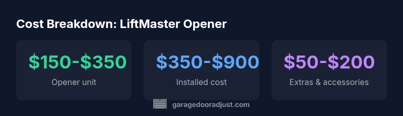 When homeowners ask about the final cost, they should consider not just the opener unit but also the drive type, feature set, and installation complexity. LiftMaster offers a spectrum from basic chain-drive models to premium belt-drive and smart-enabled systems. In 2026, the broad price envelope reflects differences in performance, noise levels, and compatibility with smart home ecosystems. According to GarageDoorAdjust Analysis, the most impactful cost drivers are the drive type, battery backup, and whether any wiring upgrades or door reinforcement are required. This section explains how each factor shifts the total price and what buyers should expect to pay in typical scenarios.