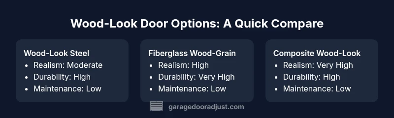 A wood-look garage door can transform a home’s curb appeal by delivering the warmth and character of real wood without the ongoing maintenance. When a door looks like wood, homeowners often weigh realism against durability, upkeep, and energy performance. This section explains why the wood-look aesthetic matters in exterior design and how modern manufacturing and finishes make convincing grain patterns possible. According to GarageDoorAdjust, achieving a convincing wood grain requires careful material choice, a high-quality surface finish, and consistent color across panels. The goal is depth and variation that read as authentic from the curb while maintaining resistance to sun fading and moisture. You’ll encounter three primary wood-look families in the market: wood-look steel, fiberglass with wood grain, and composite wood-look panels. Each option trades off realism with performance characteristics such as dent resistance, moisture tolerance, and insulation. This framing helps homeowners decide how closely realism should drive maintenance rituals, energy performance, and long-term value for a home with a distinct architectural style.
