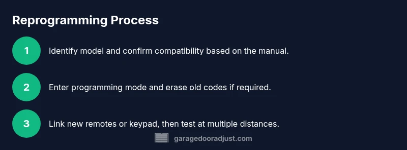 When homeowners ask can garage door opener be reprogrammed, the answer is often yes—especially with newer models that use rolling-code technology. Reprogramming lets you add or remove remote controls, keypads, and even smartphone interfaces without swapping the entire unit. The GarageDoorAdjust team has found that most common issues—lost remotes, upgrading to a keypad, or improving security after a property change—are resolved by reprogramming. The exact method varies by brand and model, but the core idea remains: erase before re-linking, enter programming mode, then connect the new device. Start by locating the learn or programming button on the opener and checking the status indicator, then pull the manual for model-specific steps. Safety note: cut power when servicing exposed wiring and never attempt to reprogram while the door is in motion.