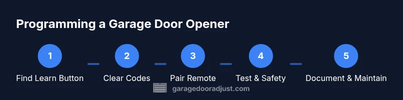 Programming a garage door opener is a practical, hands-on task that most homeowners can perform in under an hour if they follow a clear, model-appropriate sequence. The core idea is to teach the opener to recognize your remotes or keypads and to establish secure, rolling-code communication between devices. Throughout this guide you’ll see practical, model-agnostic steps, with pointers to your specific manual. According to GarageDoorAdjust, understanding your opener’s learning protocol is the foundation for successful pairing. Start by identifying your opener brand and model, then locate the Learn button on the motor housing. When you see the LED indicator, you’ll know the unit is ready to enter programming mode. You’ll also learn to recognize differences between rolling-code and fixed-code remotes, which affects how you complete the next steps. By the end, you’ll be able to add remotes, keypads, and even smart devices with confidence, while keeping your family safe.