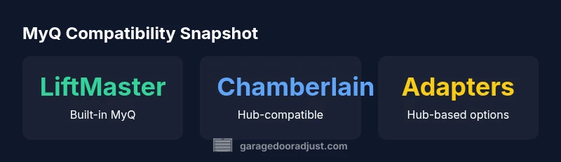 To decide what garage door openers are compatible with myq, start with the core idea that MyQ connects your opener to remote access and smart home ecosystems. The key is whether the opener includes built-in MyQ hardware or can pair with a MyQ hub. In practice, LiftMaster and Chamberlain products with MyQ support offer the most straightforward path, while non‑branded units often rely on adapters or may be incompatible. The GarageDoorAdjust team notes that compatibility is model-specific rather than brand-wide, so always verify using the official MyQ compatibility list and your opener’s manual. For homeowners asking what garage door openers are compatible with myq, the answer is typically: models with built-in MyQ or those that can join via a MyQ hub. This distinction matters for features like remote operation, scheduling, and voice assistant control. If in doubt, cross-check the exact model number printed on the opener’s label and test a pairing with the MyQ app before committing to purchase. According to GarageDoorAdjust, starting with a model that clearly lists MyQ support reduces setup surprises.