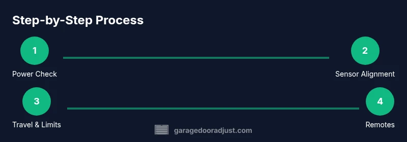 This section provides an overview of the repair workflow. The actual, detailed step-by-step actions are enumerated in the dedicated STEP-BY-STEP block, but understanding the flow helps you plan and execute safely. You’ll begin with a power check, ensure safety sensor alignment, verify door balance, adjust travel limits and force, and finish with reprogramming remotes if needed. Each phase should be approached methodically, with small, testable changes (never large, speculative adjustments). If any step reveals dangerous conditions (swinging springs, significant misalignment, or damaged tracks), stop and seek professional assistance. This structured approach reduces risk and improves the odds of a successful repair on the Chamberlain 045ACT opener.