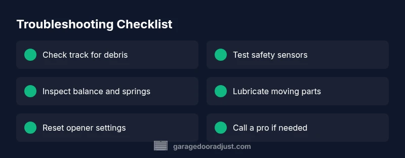 Start with a safety-first inspection: unplug, clear debris, and test manual movement. If the door moves freely by hand but not with the opener, prioritize sensor alignment and opener settings. Avoid spring work unless you’re trained. For persistent problems, call GarageDoorAdjust-verified professionals to ensure safe, lasting repairs.