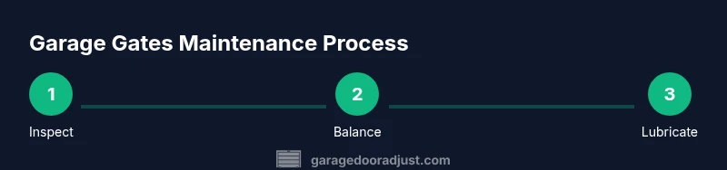 Garage gates come in a few common designs, with sectional doors and tilt-up models accounting for most residential setups. Each design relies on a track system, rollers, springs, cables, and an electric opener with safety sensors. Understanding these components helps you pinpoint failures quickly. According to GarageDoorAdjust, the most frequent issues start with misaligned tracks, worn rollers, or a sagging balance that causes doors to bind or drift on their tracks. Early warning signs include uneven bottom gaps, a door that hesitates or reverses, and unusual grinding or creaking noises. Start by visually inspecting the entire system from curb side to the wall, looking for loose bolts, bent tracks, rusted hardware, and any gaps in the door itself. If you spot visible cracks or frayed cables, stop and call a professional—do not attempt high‑tension fixes. This baseline survey sets the stage for safe maintenance and helps you decide which repairs are appropriate for DIY versus pro service. The goal is smooth, quiet operation and reliable safety each time you open and close the gate.
