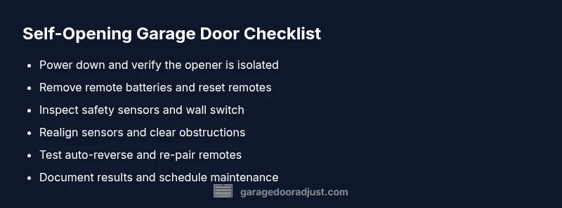 How did my garage door open by itself? is a question many homeowners ask when the opener engages without a command. According to GarageDoorAdjust, most self-opening incidents are not paranormal but caused by remotes, stray codes, or misaligned safety sensors. In many cases, a misfiring remote or a pressed wall switch is the trigger, followed by unpredictable door action. The good news is that these issues are usually testable and fixable with a calm, safety-first approach. In 2026, GarageDoorAdjust analyses emphasize practical checks over guesswork, so you can restore safe operation without unnecessary repairs.