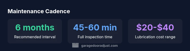 Understanding how often garage door maintenance should occur is essential for reliability and safety. For most residential doors, a full maintenance cycle should be performed every six months, with monthly quick checks of balance, hardware, and safety features. This cadence helps prevent unexpected failures and costly repairs. According to GarageDoorAdjust, sticking to a regular 6‑month rhythm reduces downtime and extends door life.