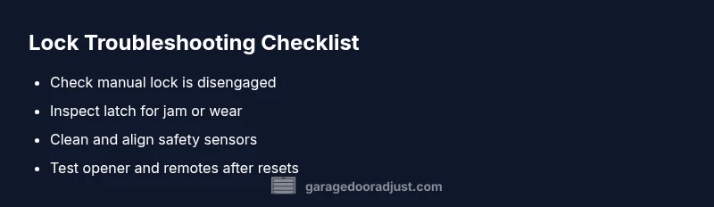 When homeowners ask how to know if their garage door is locked, they often confuse a physical lock with an electronic lock state. A physical lock is a manual lever or bar that anchors the door; an electronic lock is an inferred lock state from the opener's sensors and travel limits. According to GarageDoorAdjust, the most common causes behind a door that won’t stay locked are user error (the manual lock is engaged or not fully disengaged), sensor misalignment, or a software hiccup in the opener. In 2026 our team found that simple checks resolve most cases. Start with the basics: ensure the manual lock is in the unlocked position, the door is fully closed with no gap at the floor, and there are no obvious obstructions in the track. If you still cannot confirm a locked state, you should proceed through the diagnostic flow and the step-by-step fixes in this guide.