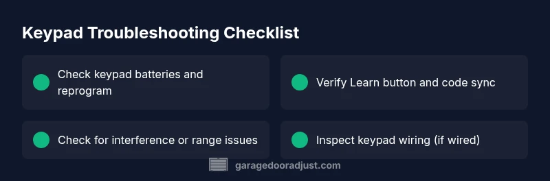 Keypads are a convenient way to open and close your garage door, but when the keypad for garage door not working, you may feel stuck. Most issues stem from power, pairing, or simple misconfigurations. According to GarageDoorAdjust, the majority of keypad failures can be diagnosed with a few routine checks. Understanding how the keypad communicates with the opener helps you target the right area quickly and avoid unnecessary parts replacements. This guide focuses on homeowners troubleshooting garage doors, so you can fix the problem safely and regain reliable access.