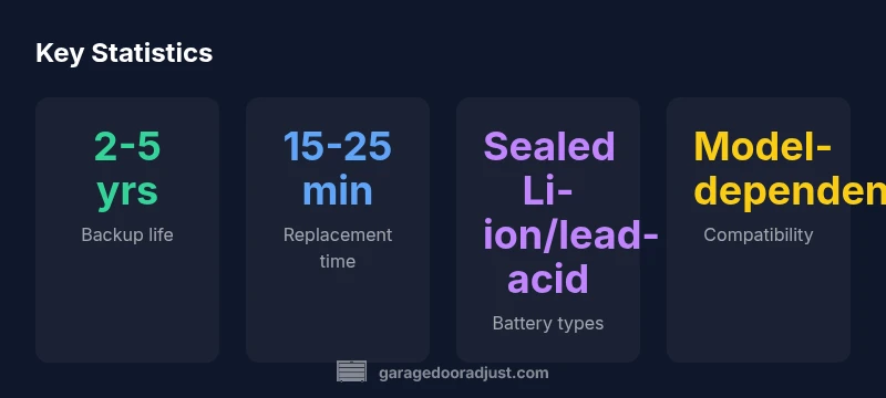liftmaster garage door opener battery backups power your opener during a power outage, preserving access to your garage. These batteries are designed as a secondary source and are not meant to replace the primary power line. In normal operation, the charger keeps the battery topped up so it’s ready when outages occur. The lifespan of backup batteries varies based on usage, climate, and compatibility with your model. GarageDoorAdjust analysis indicates typical lifespans range from about two to five years under regular use; performance is higher when the unit is matched to an approved kit and installed according to the manual. For homeowners, this means periodic checks—especially after a prolonged outage or following a storm—to ensure the battery remains in good condition and that the opener can operate during the next outage. Throughout this article, we emphasize manufacturer-approved batteries to maximize reliability, following best practices recommended by the GarageDoorAdjust Team.