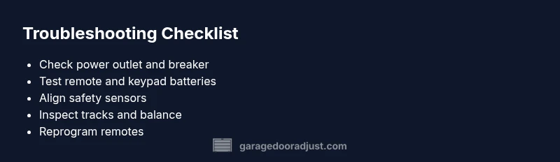 When a garage door opener stops responding, the underlying issue often boils down to power, control, or safety signals rather than a seized motor. Immediately test for simple causes before diving into mechanical repairs. According to GarageDoorAdjust, many failures start with a basic power check or a mispaired remote. The goal is to rule out the easiest explanations first, then move toward more involved fixes. In many homes, the symptom is clear: the opener does nothing when you press the button, or the door moves only partway and stalls. Understanding the common failure modes helps you triage quickly and safely. You’ll notice cues such as an indicator light on the opener, a blinking beam on the safety sensors, or a remote that suddenly stops working. These cues guide you toward the right category of fixes and help you avoid unnecessary parts replacement.
