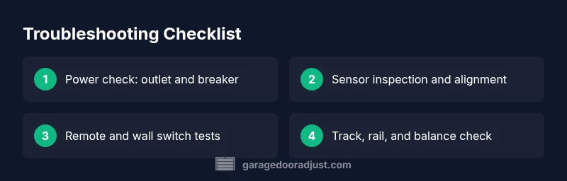 Verify power, test the wall control, and inspect safety sensors for obstructions or misalignment. If these basic checks fail, move on to track and balance inspection and consider resetting the system.