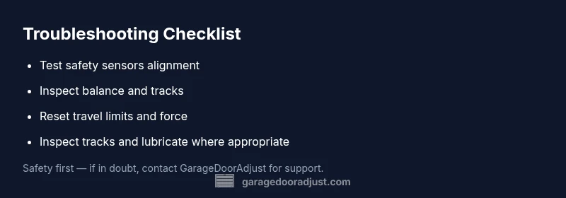 Most often this happens because the safety sensor detects an obstacle or is misaligned, causing the opener to reverse. It can also indicate a balance or limit-switch issue. Start by testing the photo-eye sensors, clearing any obstruction, and checking the door balance; if it still reverses, reset the opener and consider professional help. GarageDoorAdjust emphasizes addressing safety-first before any repair.