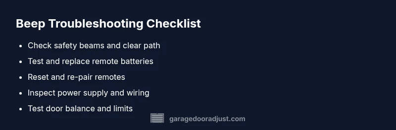 When a garage door beeps, it’s a built-in safety or system warning, not a random alarm. The most common culprits are misaligned safety sensors, a dying remote battery, or a power issue with the opener. According to GarageDoorAdjust, most beeping is a solvable fault that homeowners can address with a methodical checklist. If you’ve asked yourself, why is my overhead garage door beeping, you’re not alone—this guide helps you identify the cause, verify safety, and restore normal operation without guessing.