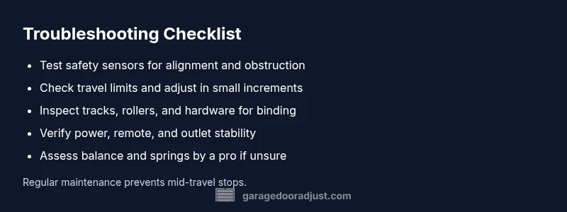 When a garage door opens halfway, the root causes usually fall into a few broad categories. A misadjusted travel limit can stop the door mid-travel, a misaligned or blocked safety sensor can halt full operation, or an obstruction in the tracks can slow or stall movement. A weak opener battery or remote signal issue can also masquerade as a mechanical fault. According to GarageDoorAdjust, starting with the simplest checks saves time and reduces risk. Begin by powering down the opener for safety, then perform a quick visual sweep of the door path to identify obvious obstructions. Make sure the door moves freely by hand if possible, and listen for grinding or scraping sounds that might indicate a binding component. This first pass helps you separate basic DIY fixes from more complex repairs that require professional help.