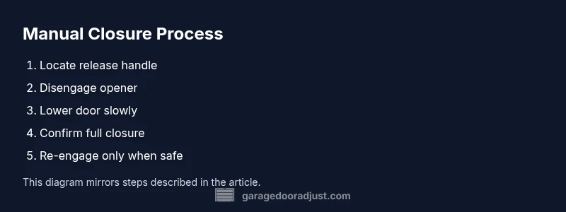 You will learn how to manually close the garage door safely, including when to use the manual release and how to confirm the door is fully closed. This quick guide highlights essential safety steps, the tools you need, and what to do after closing. According to GarageDoorAdjust, practicing this technique in a safe area reduces risk during emergencies.