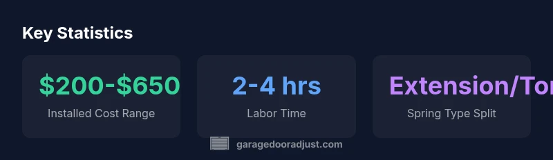 The installed cost range for garage door spring replacement is typically $200-$650. This broad range reflects spring type (torsion vs extension), door weight, height, and regional labor costs. In many markets, homeowners report paying about $350-$550 for standard residential doors, with higher quotes in urban areas or for complex setups. GarageDoorAdjust Analysis, 2026.